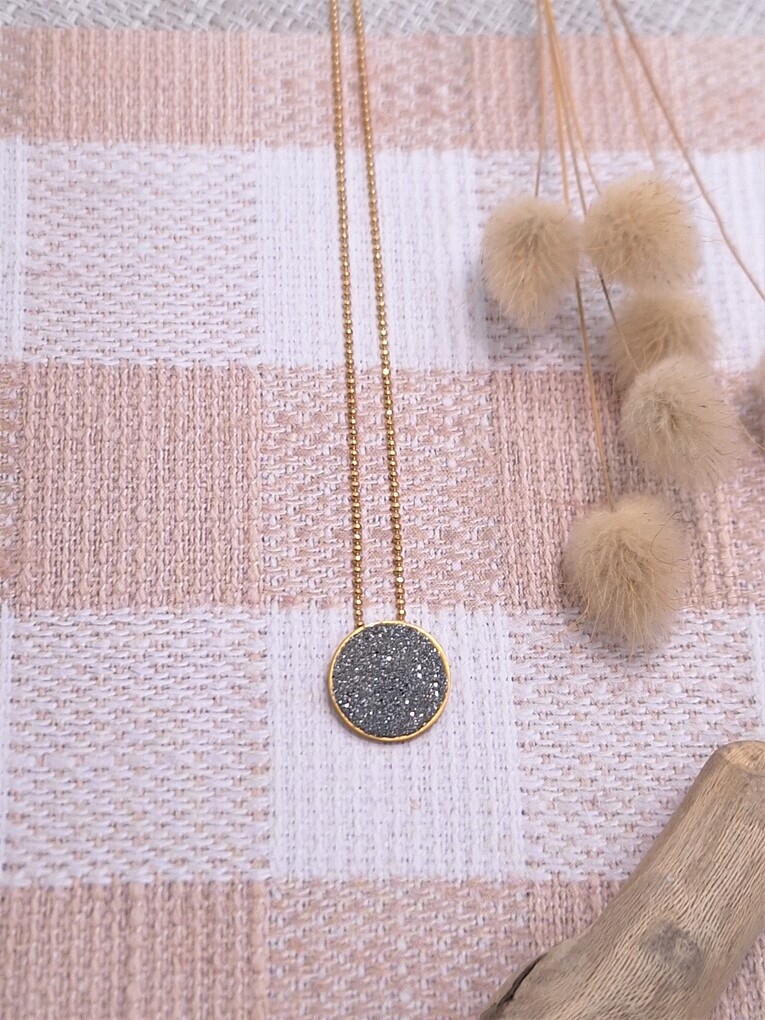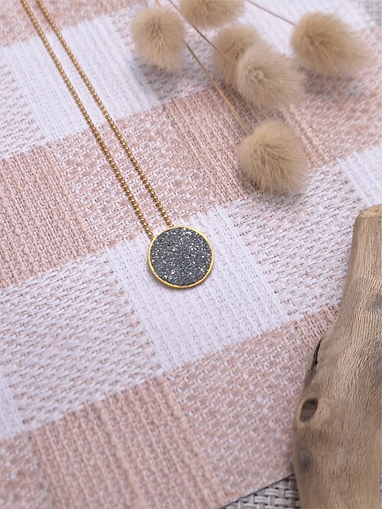 Ασημένιο επίχρυσο κολιέ σε σχήμα κύκλου με γκρι σμάλτο που δίνει το εφέ του τσιμέντου.