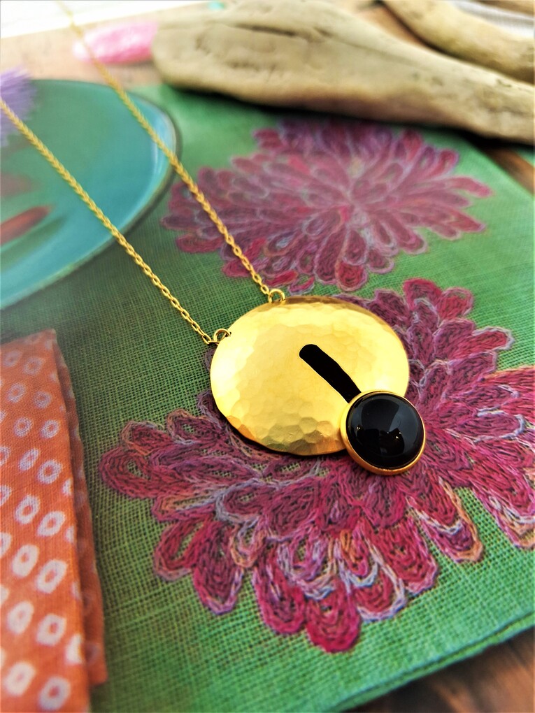 Εντυπωσιακό σφυρήλατο κεντρικό στοιχείο από επιχρυσωμένο ορείχαλκο με λεπτομέρεια από όνυχα και ατσάλινη υποαλλεργική αλυσίδα.