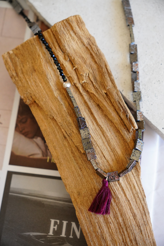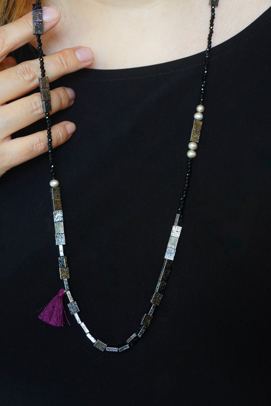 Κολιέ με αιματίτες και μαργαριτάρια. Καθαρή γραμμή και μεταλλική λάμψη.