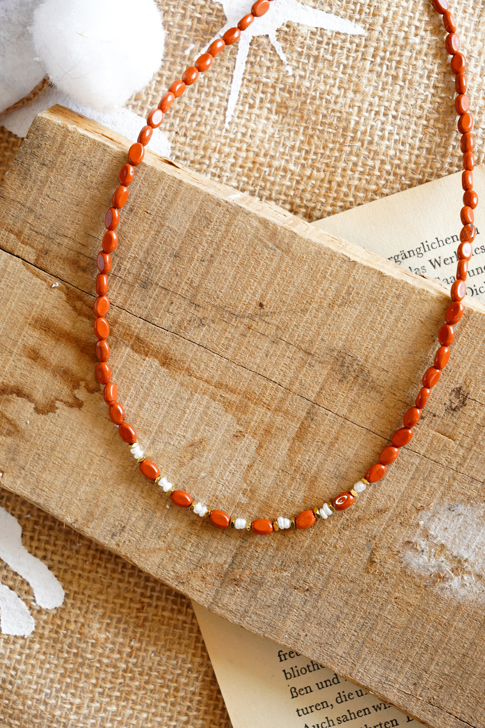 Κολιέ με καλλιεργημένα μαργαριταράκια πλαισιωμένα με χρυσούς αιματίτες και sandstone.