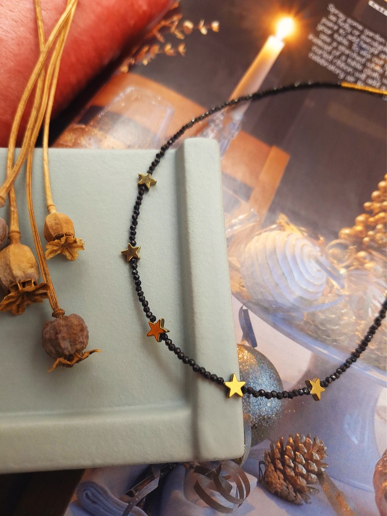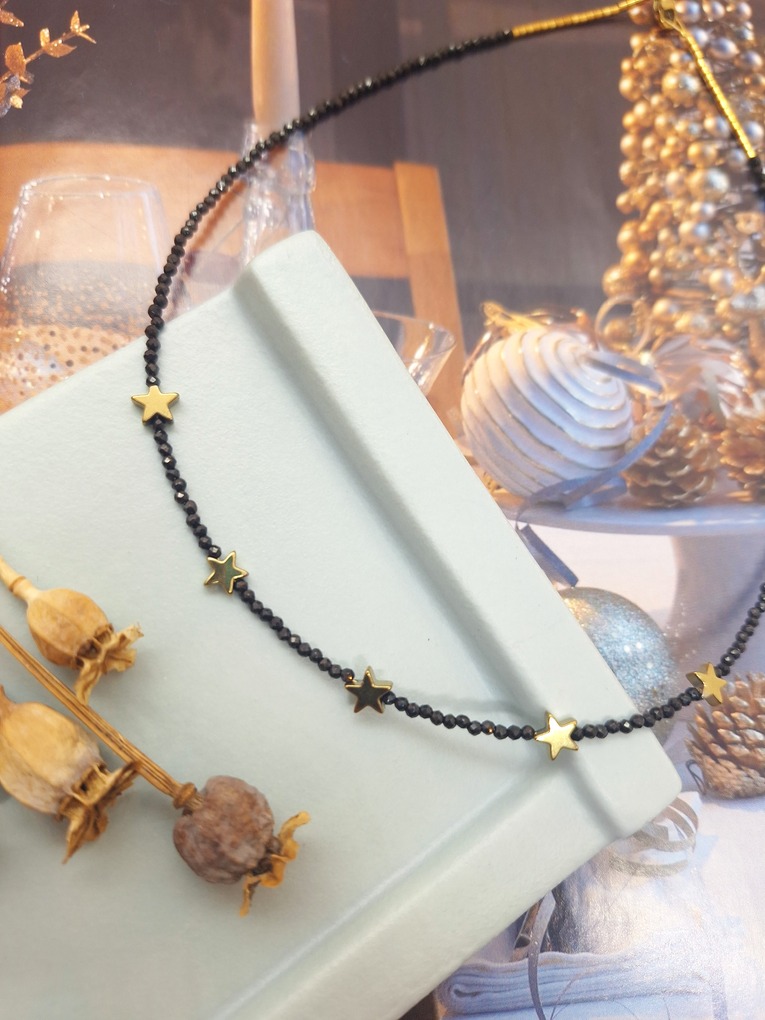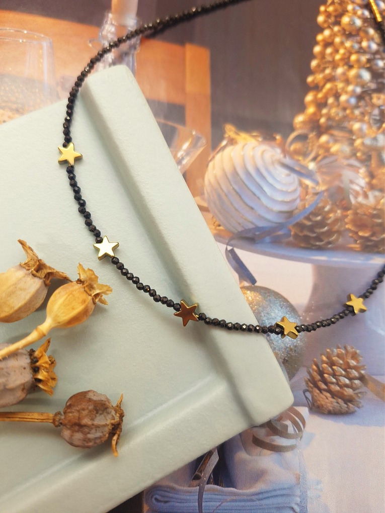 Λαμπεροί αιματίτες σε σχήμα αστεριού πλαισιωμένοι από μαύρες κρυστάλλινες χάντρες.