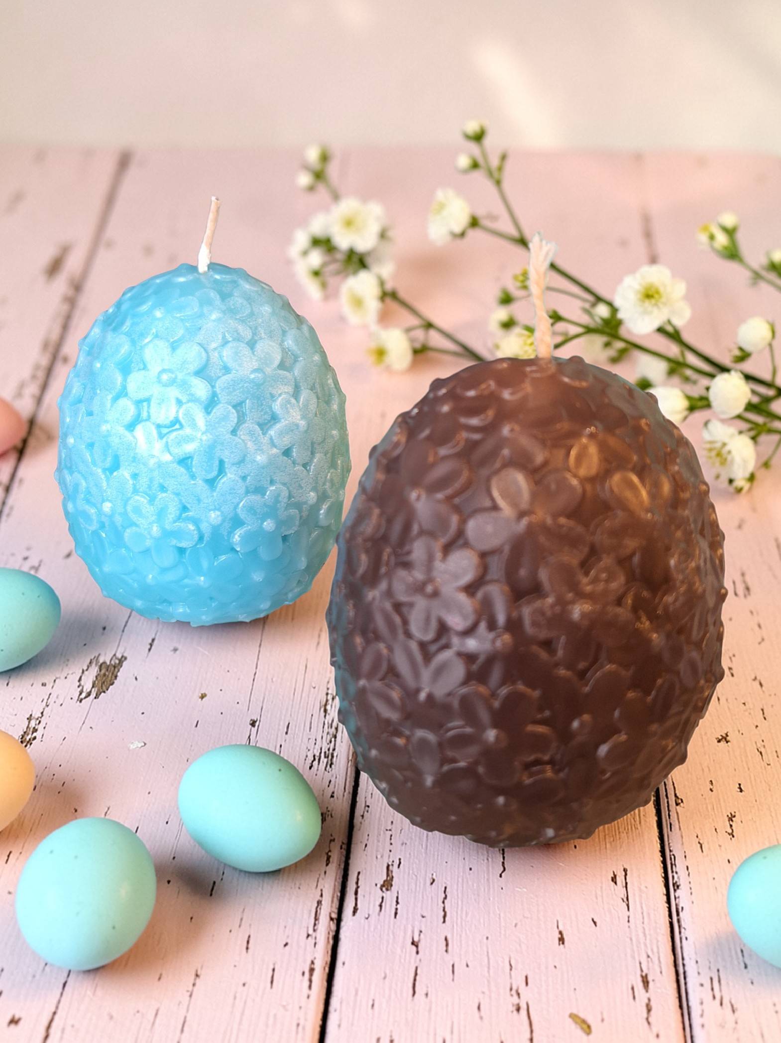 Κερί σε σχήμα αβγού με ανάγλυφα λουλούδια, σε δύο αποχρώσεις