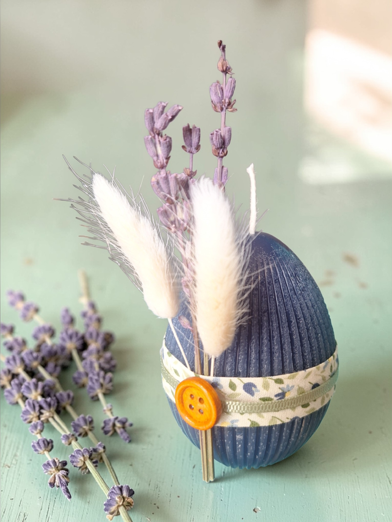 Κερί σε σχήμα αβγού. Τρισδιάστατο, με ανάγλυφη επιφάνεια. Μία λεπτεπίλεπτη σύνθεση από αποξηραμένη λεβάντα υπογραμμίζει το πνεύμα της εποχής.