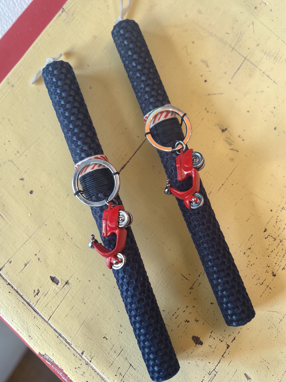 Χειροποίητη λαμπάδα από αρωματικό μελισσοκέρι με μπρελόκ με θέμα ένα κόκκινο βεσπάκι.